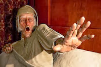 Scroodge se mueve entre la risa y el terror. No obstante,le impresiona al ver que el espectro le ha leído el pensamiento. No sabe si es un sueño, pero pronto abandona el terror porque ve que es una anciana que, con poco, puede dominar. Duda también de si habrá alguna cámara detrás de la cortina.