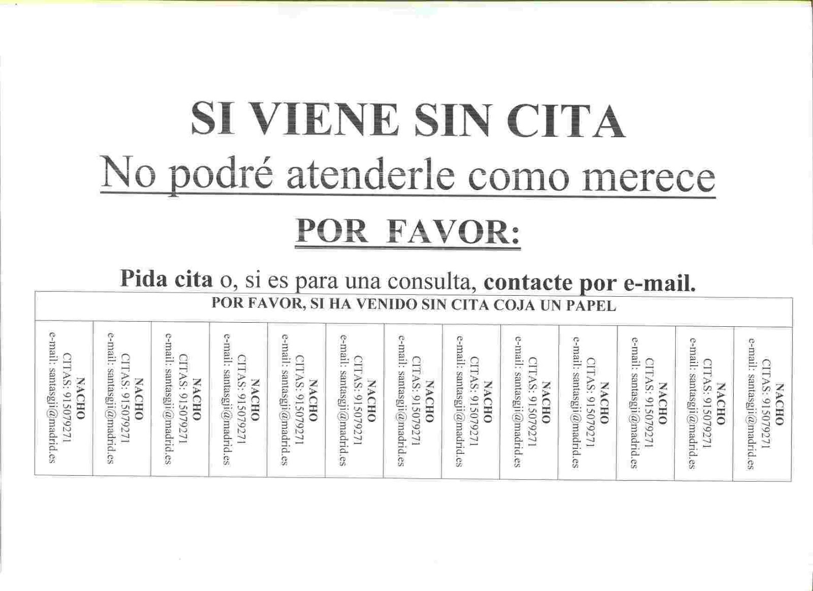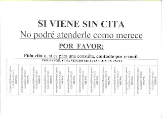 Y es que el otro día me decía una compañera que, a veces, no nos paramos a pensar en la puerta del despacho (en ocasiones heredamos un despacho y no caemos en este pequeño pero importante detalle) y resulta que es más grande el cartel de «no se atiende sin cita» que el del nombre del profesional que le va atender.