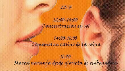Bueno, es una reflexión general, pero no puedo evitar acabar diciendo que el 23 F habrá una movilización general «contra el golpe de los mercados»: una demostración de fuerza ciudadana para reclamar que las decisiones las debemos tomar nosotros/as, y no los poderes financieros o económicos. Está montado desde la ciudadanía (no participan organizaciones «formales»). Os animo a participar, ya sea anaranjados, o como queráis. En Madrid la gente de Intervención Social en Lucha -por cierto, os animo a pasar por su web y participar- ha hecho (con otros) esta propuesta de concentración, aunque la mani gorda es por la tarde, en Neptuno a las 18.00. Yo iré, creo que por otro lado, por motivos familiares, pero anaranjado, claro.