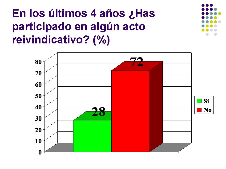 Las contestaciones al cuestionario se pueden ver en el siguiente gráfico (el cuestionario fué pasado en septiembre). El debate fué muy interesante, experiencias sobre actos reivindicativos en los que alguna persona había participado, y, algo aún más importante: poder salir del tema de las necesidades individuales, a las necesidades colectivas (esto sólo es tratable en grupo). Y sobre la siempre presente pregunta ¿SIRVE PARA ALGO?… ¿»algo» es sólo «conseguir el cambio político que se pretendía, la paralización de una medida, de una ley?» ¿o hay otros «algos»?